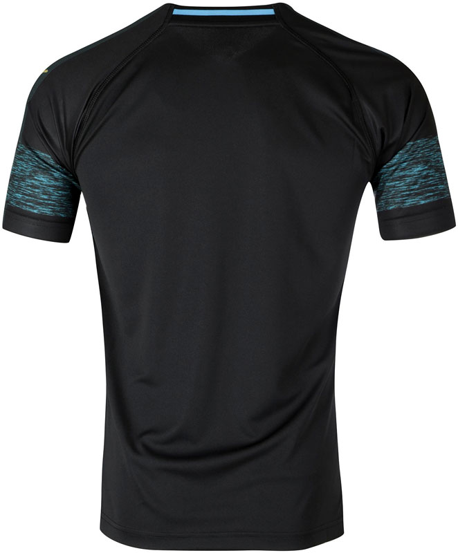 ブラックを基調に、胸のグラフィックと袖のストライプをブルーで彩色。そのコントラストが印象的なデザインだ。