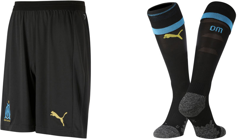パンツ、ソックスともにブラックを基調。ソックスはブルーのストライプと“OM”が色鮮やか。