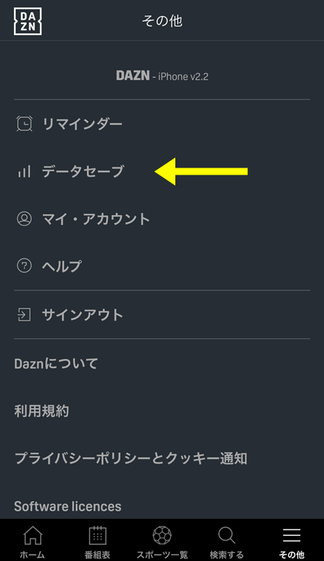 1.DAZNアプリから「その他」ボタンを選択(Androidでは ボタン、iOS では下のメニューバーから)