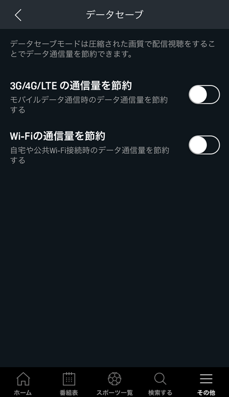 このデータセーブ機能をオンにすると、3G/4G/LTE使用時や、テザリングやモバイルなどのWi-Fi使用時、それぞれのパケット通信量を節約でき、より手軽にモバイルでスポーツを楽しむことができる。