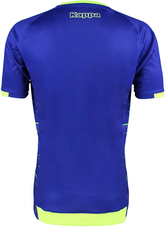 レプリカ版は背面がシンプルにブルー一色だが、選手着用品には背面に大きなメーカーロゴマークをプリントしている。
