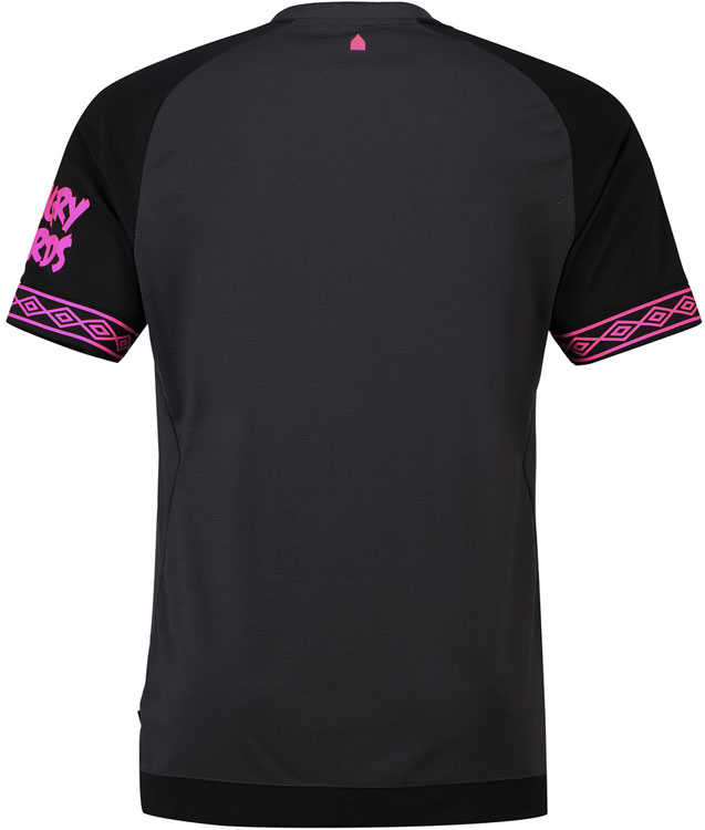 新しいアウェイキットの色はボディ部分をダークグレーで、袖はブラック。メーカーロゴやエンブレムは発色の良いピンクで彩った。