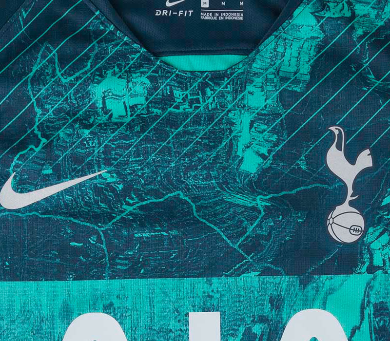 胸のグラフィックのアップ画像。地図や航空写真を使う手法は、なかなかユニークだ。あまり冒険しない“手堅いデザイン”が多かったトッテナムのキットでは異色の存在といえる。