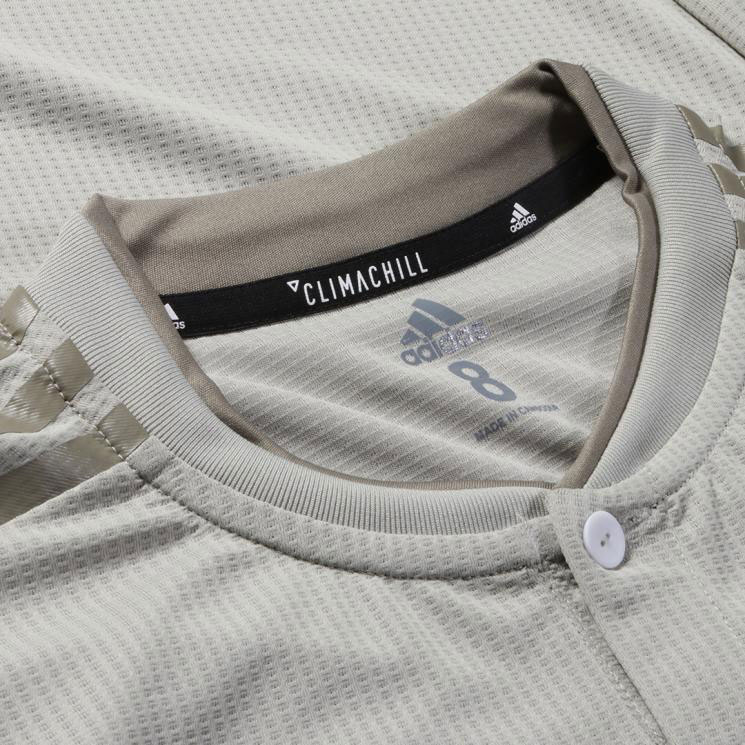 首周りはシングルボタン止めのヘンリーネック。濃淡異なる2色のベージュが良いアクセントに。