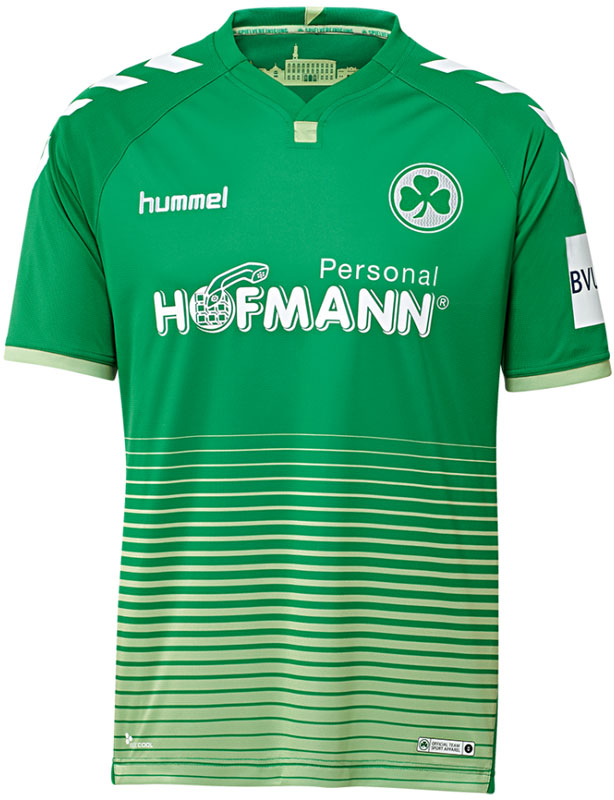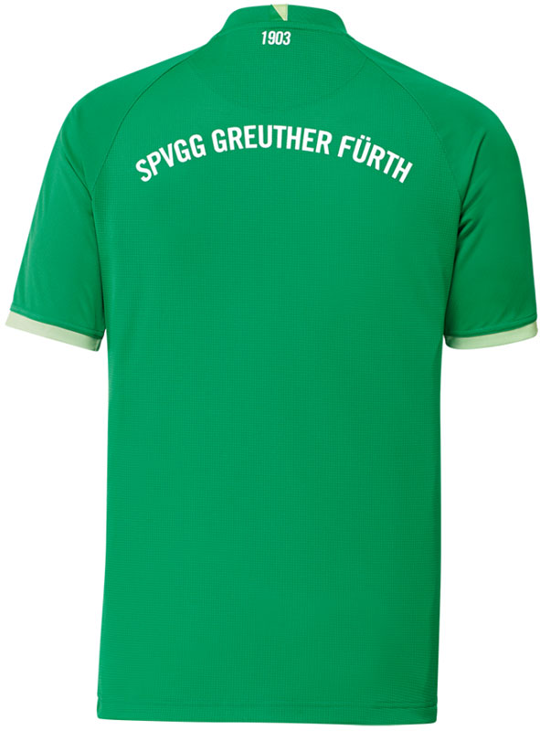 新しいアウェイキットはグリーンを基調に、胸から下の水平ストライプが特徴的なデザイン。首元の内側にはフュルトの街のスカイライン(空を背景とした建築物の輪郭線)を描く。