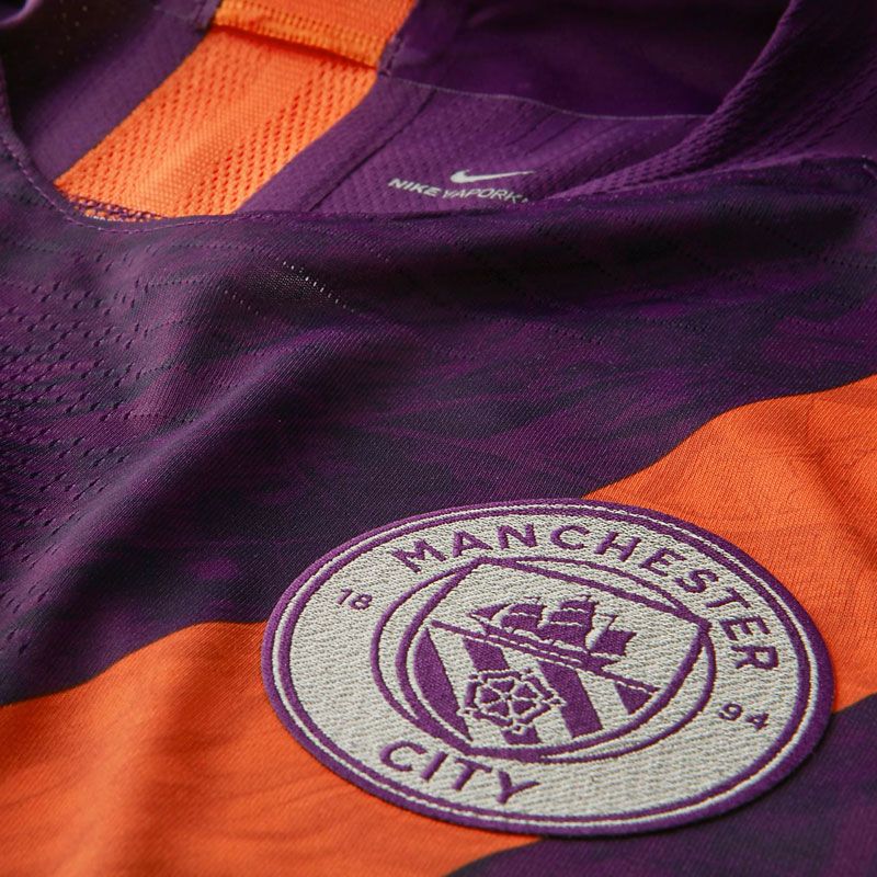 エンブレムの色はキットに合わせてパープルを基調。8年ぶりに復活したサッシュ(肩帯)はエンブレムにも描かれているが、これはマンチェスター市の紋章がデザインの元となっている。