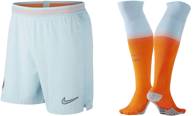 パンツはライトブルーを基調としたデザイン。ソックスはオレンジとライトブルーのカラーコンビネーションで、前面にスウッシュ(Nikeロゴ)とチーム名の略称“CFC”のグラフィックが入る。