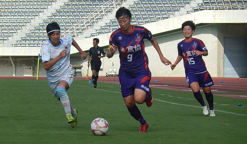 攻撃は主将の大型FW足立英梨子(上記写真の9番)が最前線でロングボールを収めたり、サイドのスペースに流れて起点となり、攻撃に“深さ”を作る。そして、速攻からは右サイドMF赤嶺美月が、遅攻では左サイドMF友近がFWから左サイドバックにコンバートされた松田遥奈との連携による左右非対称なサイド攻撃で“幅”も作れていた。
