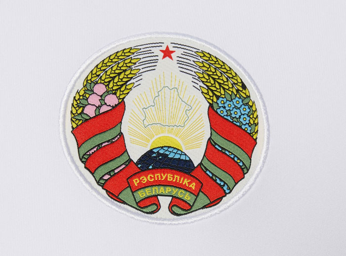 左胸にはBFFのロゴマークではなく、ベラルーシ国章を装着。ライ麦のリースを“ピンクのシロツメクサ”と“水色の亜麻の花”で飾り、地球から昇る太陽や国土の形をデザイン。下部には国名を記している。