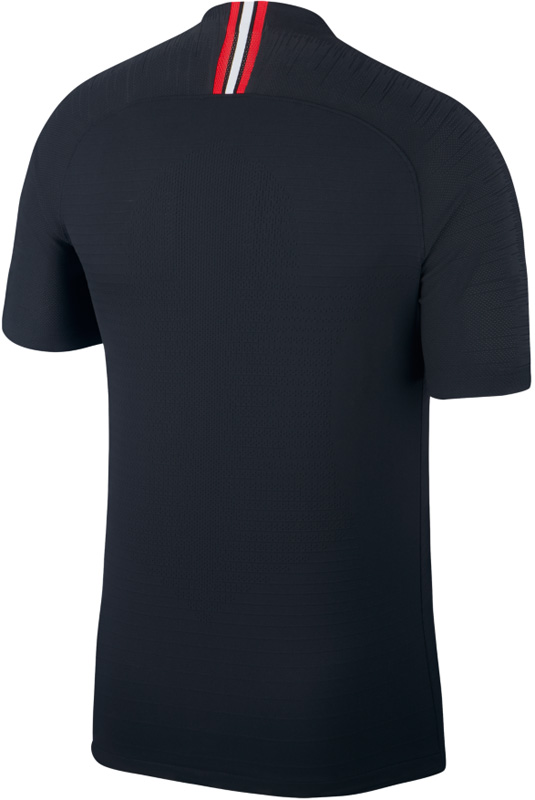 背面はブラック一色で、首元にはレッド/ホワイトのメッシュテープ。PSGでダークカラーのキットは珍しくないが、色の使い方や細かなデザインはいつもと異なり独特な雰囲気。