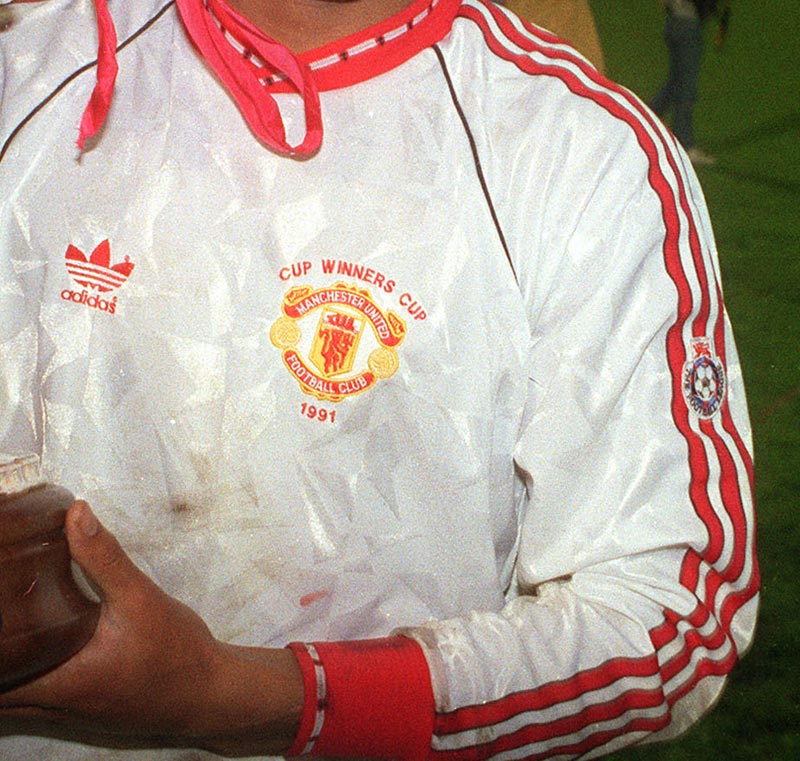 シャツ全体に幾何学模様の透かしが入り、“CUP WINNERS CUP 1991”の文字がエンブレムを飾る。