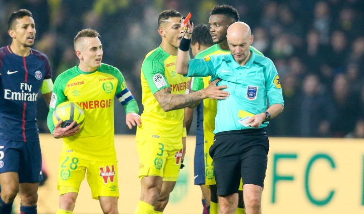 ナントDFジエゴ・カルロスと接触して転倒したトニー・シャプロン主審が、蹴りを見舞って“報復”したうえで彼を退場にしたのだ。