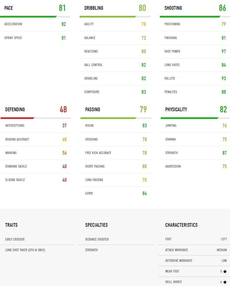やはりというべきが、シュート力は圧巻97!そして、得意とするボレーも93と高レートに。
