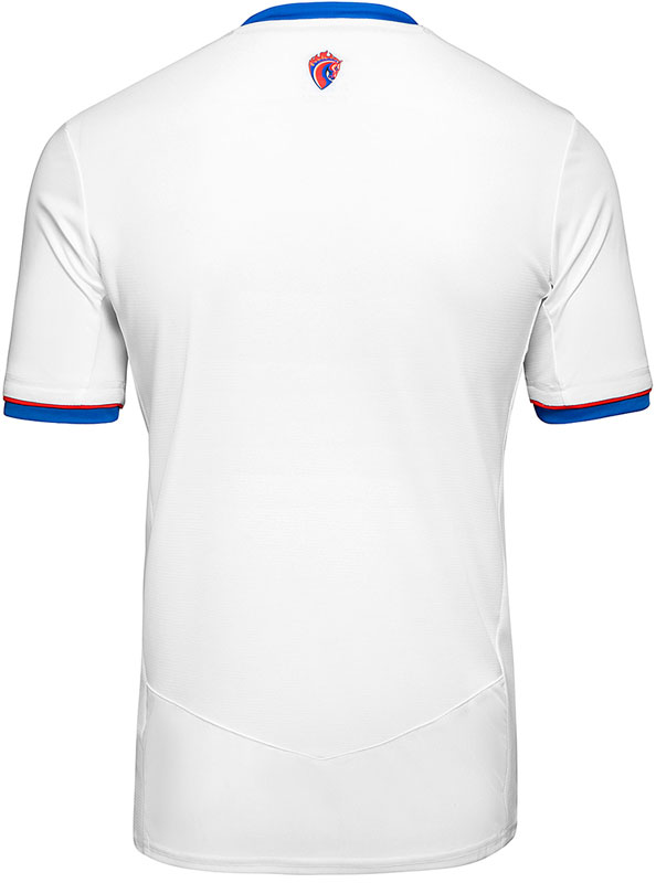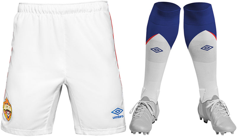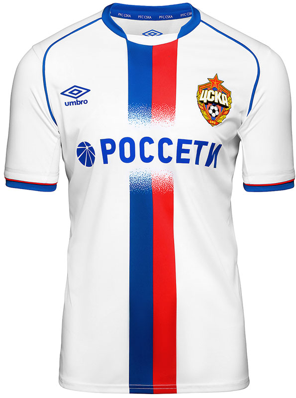 新しいアウェイキットは、中央に2色のストライプを配したデザイン。このスタイルは2000年代前半のUmbroによく見られたもので、CSKAも2004年のアウェイキットで採用している。胸スポンサー「Россети(英名Rosseti)」はロシアの電力会社。