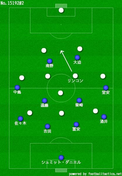 後半に入ると大迫と南野はお互いの間を閉めてリンコンへのパスコースを防ぎつつセンターバックにプレスに行き、ひとまずリンコン問題は解決したがこれからは前半の内に修正したいところである。