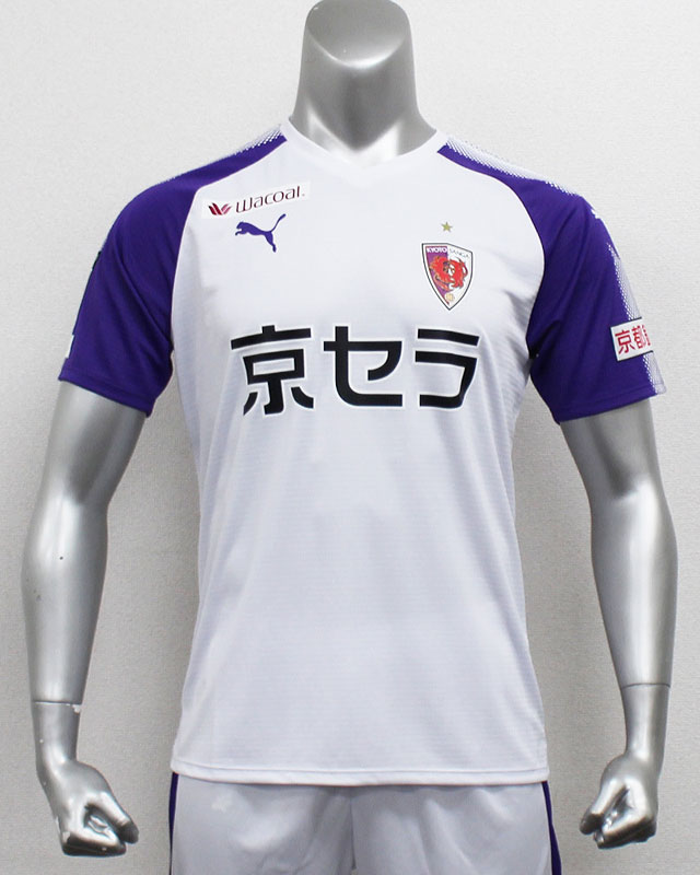 新しいアウェイは、伝統のホワイトを基調にパープルの差し色。各部のスポンサーは、胸に「京セラ」、右鎖骨には2018シーズンまでキットサプライヤーを務めた「Wacoal」のスポンサーロゴを掲出する。