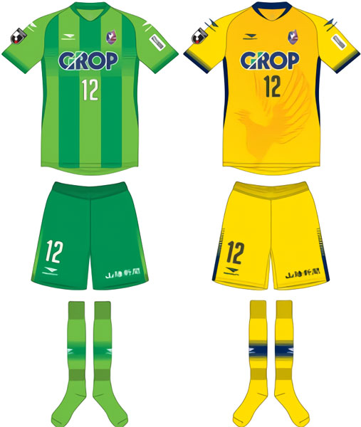 GKキットは2色を投入。ホームはフラッシュグリーンで岡山の豊かな自然をイメージしている。アウェイはイエローを基調に、フィールドプレーヤー用と同じく雉の透かしプリントというデザイン。