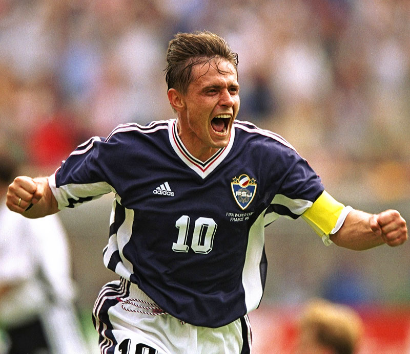 ネイビーを基調に汎スラブ色のデザインが、シンプルで美しい一着。国連によるユーゴスラヴィア制裁の一環で、一時期は国際舞台から締め出された代表チームにとって、制裁解除後初の大舞台が1998年W杯。当時名古屋グランパスに所属していたドラガン・ストイコヴィッチはキャプテンとしてチームをけん引し、ドイツ代表戦ではゴールも決めている。