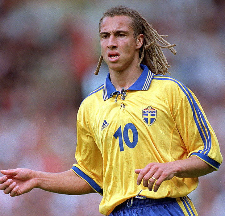 胸元が編み上げスタイルのクラシックなデザインが大人気。このキットを着たスウェーデン代表は、98年9月から始まったユーロ2000予選・グループ5でイングランド代表を抑え、圧倒的な成績で首位通過を果たした。