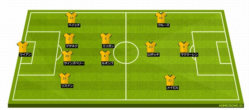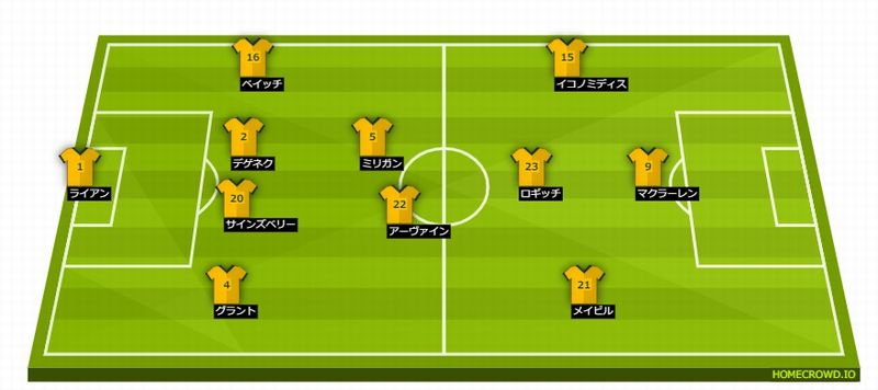 絶対的司令塔のアーロン・ムーイがメンバーから外れてしまったため、ゲームを作れる選手はいない。その分ウイングのメイビルらの飛び出しやドリブルが攻撃の鍵を握っている。