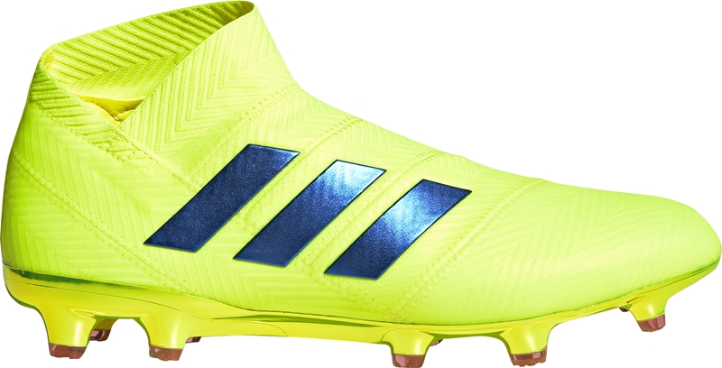 高伸縮性バンデージによるブレない安定感が嬉しい『ネメシス 18』。メッシモデルも統一された同スパイクの新色は、ソーラーイエロー×フットボールブルー×アクティブレッドとなっている。