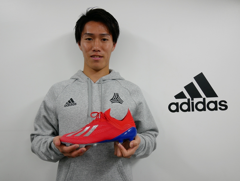 『エックス 18』の新色「イグジビットパック」がお気に入りの様子だった遠藤。下部組織から横浜F・マリノス一筋ということを考えると、カラーリング的に納得だろうか。