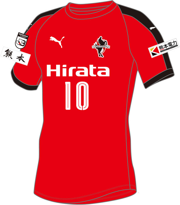 各部のスポンサーは、胸が「Hirata(平田機工)」、背中上が「マイナビ」、背中下が「白岳(高橋酒造)」、左袖は「熊本電力」、そして画像は無いがパンツは「サトウロジック」に。なお、今季からはシャツに選手名をプリントするとのこと。