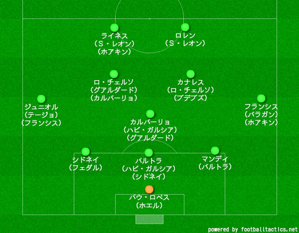 セルヒオ・カナレス、ジョバニ・ロ・チェルソがゲームメイクを担い、右ウイングバックのフランシス、左ウイングバックのジュニオル・フィルポ(またはクリスティアン・テージョ)が攻撃の幅を生む。
