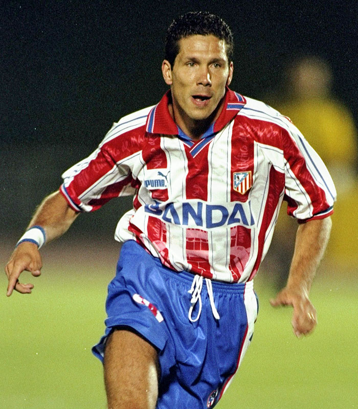 旧ホームスタジアム「ビセンテ・カルデロン」の透かしプリントが特徴のユニフォーム。胸スポンサーはこのシーズンのみ、日本の玩具メーカー「BANDAI」だった(当時は海外でも同社の商品『たまごっち』がブームに)。画像の選手は現監督のディエゴ・シメオネ。