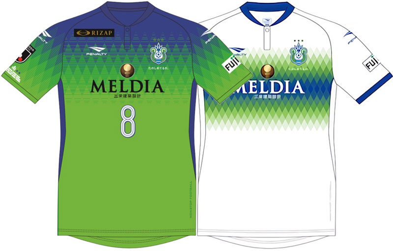 胸のグラフィックがきれいな湘南のユニフォーム。そのデザインコンセプトは、「VICTORY TAPESTRY/勝利へのつづれ織り」だ。右袖にはホームタウンの9市11町名を表記する。