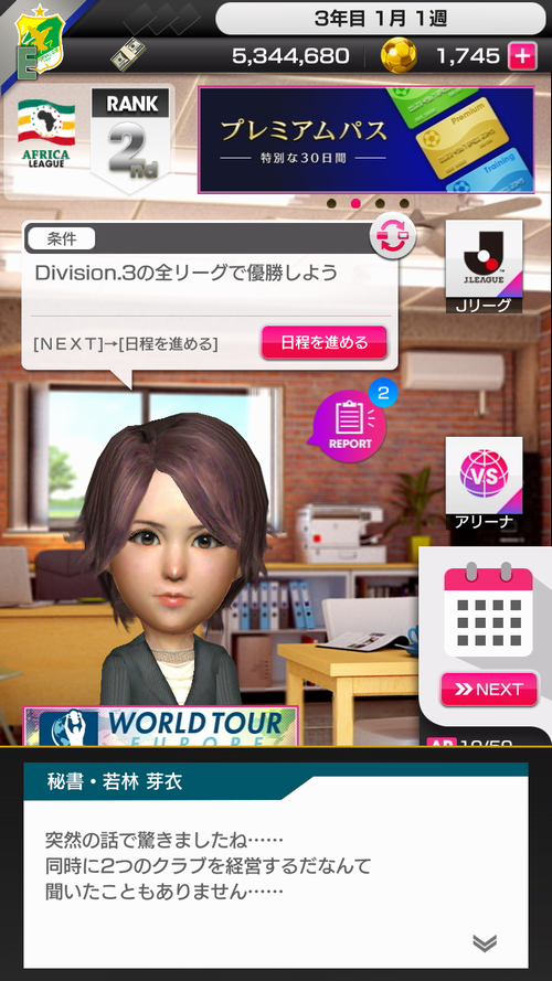 ゲームは秘書からJリーグクラブのチームを経営して欲しいと頼まれるところから始まる。Jリーグモードは本編とは独立して行われる。スタミナは本編もJリーグも共通だが、Jリーグモードは日程進行が別になっている。