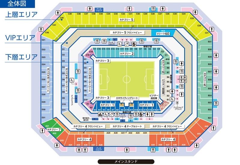 パナソニックスタジアム吹田は、収容人数39,694人のサッカー専用大型スタジアムで、座席エリアが大きく分けて上層、下層、VIP層に分かれている点が特徴だ。