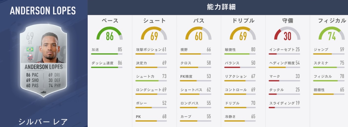 総合値は8ポイントアップしている。もともとスピードの値は高いが、決定力やドリブル、フィジカル値が上昇。かなりいい感じになっている。