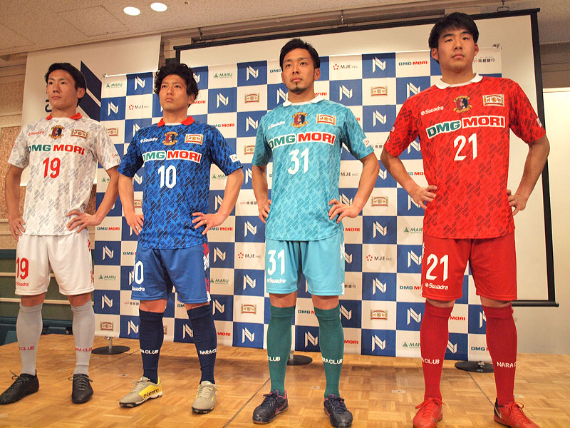 コンプリートルックはこんな感じで、パンツとソックスはシャツと同系色でまとめる。キットサプライヤーは6年目のSquadra(スクアドラ)だが、ソックスのみKITAI(キタイ)がサプライする(写真:奈良クラブ)。