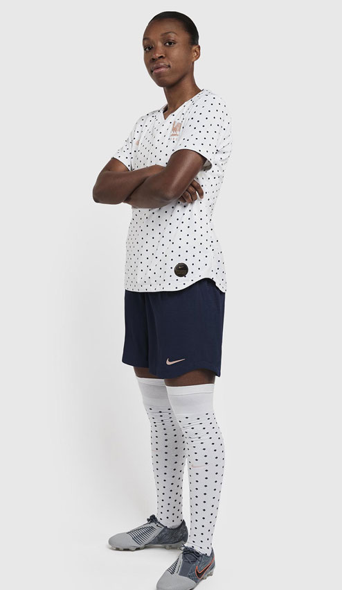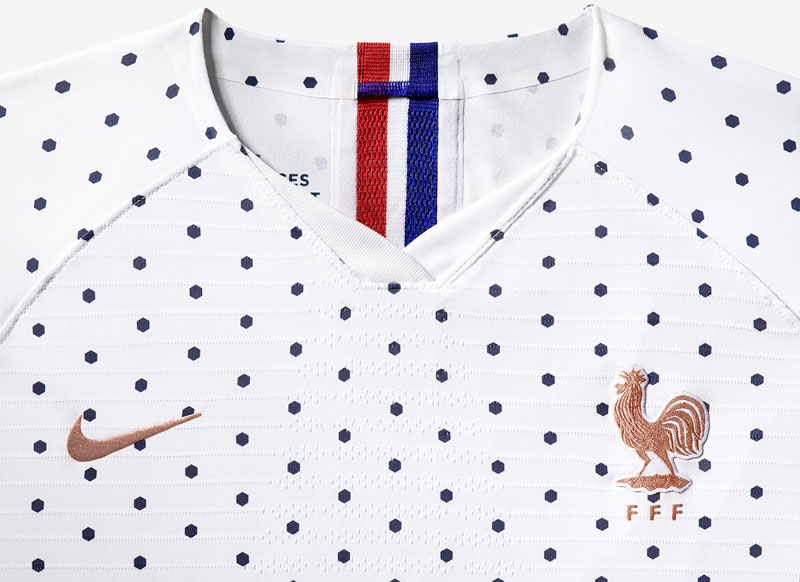 丸ではなく六角形。これはフランスサッカー連盟のエンブレムと同じ形だ。右胸のスウッシュと左胸のチームエンブレムは、ホームと同様にローズゴールドで彩る。