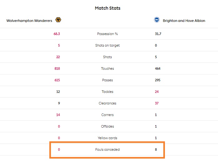すると、ブライトン側のファウル数が8だったのに対して、ウルヴスは確かにゼロだった。