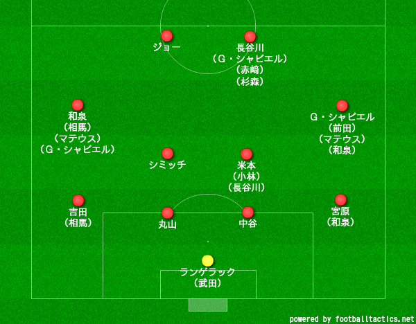 2トップは得点源のジョーを軸に長谷川アーリアジャスール、赤﨑秀平らが起用されている。