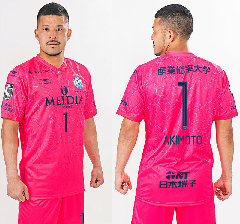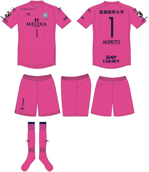 七夕記念のGKユニフォームは鮮やかなピンク。スポンサーロゴなどの色はネイビーで統一している。