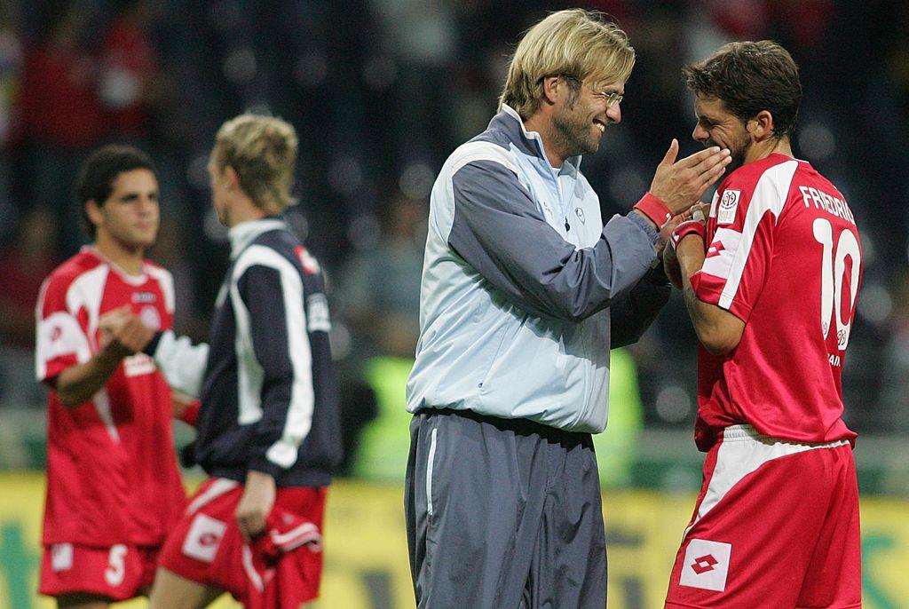サッカー界随一のビンタ愛好家として知られるクロップ監督。画像は2005年のマインツ時代であるが、その頃から愛情表現の一つとしてビンタを利用している。