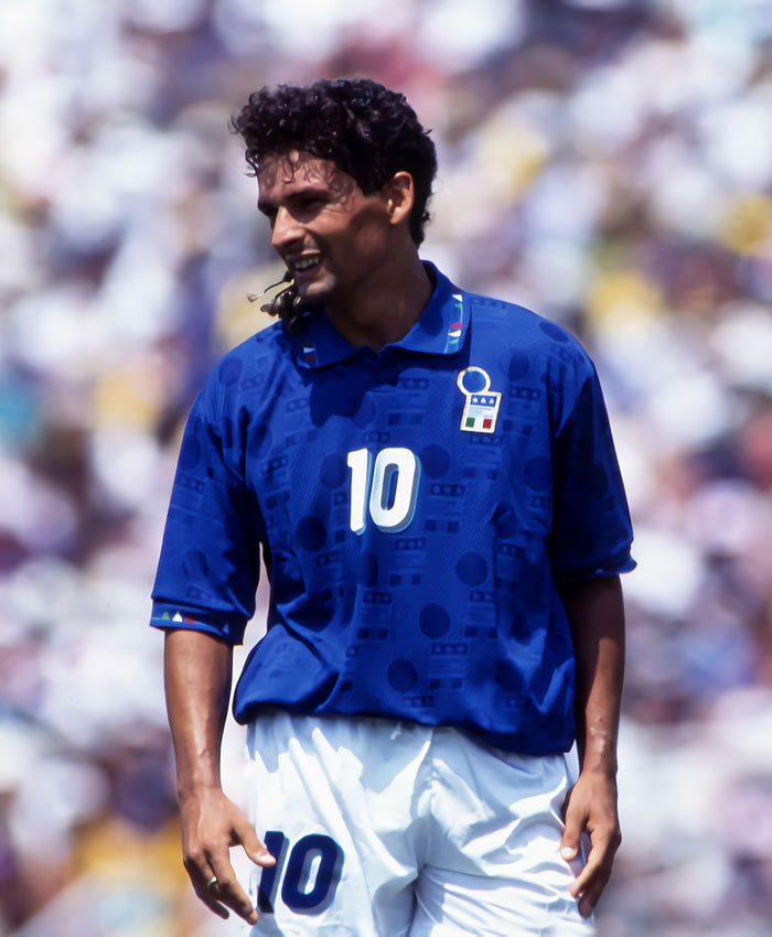 1994年のワールドカップで着用したユニフォーム。当時はユニフォームにメーカー名を掲出してなかった。見た目はシンプルながら、シャツ全体にエンブレムの透かしプリントが入る凝った作りで、現在でも人気の高いキットだ。