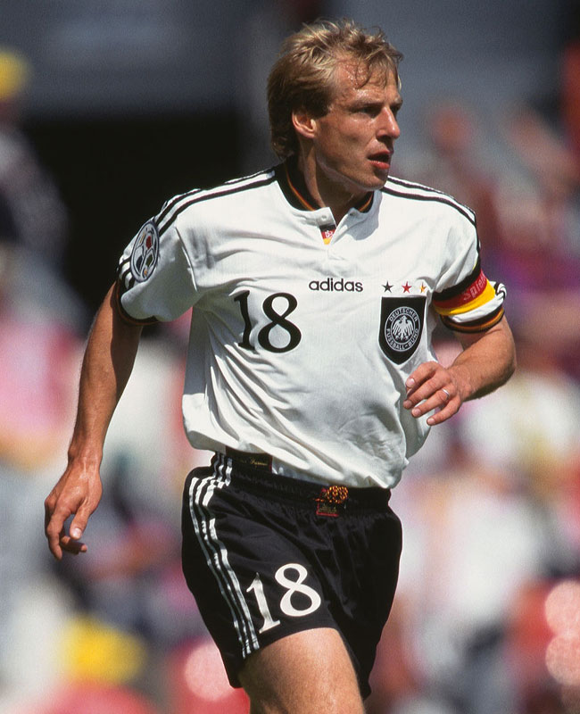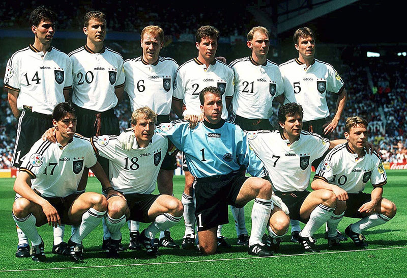 ドイツ代表が優勝した1996年の欧州選手権(ユーロ96)で着用したユニフォーム。国旗カラーが少なめのシンプルなデザインで、盾形エンブレムが特徴的だった。