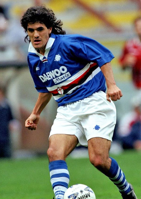 青・白がチームカラーのアンドレア・ドリアと、白・赤・黒のサンピエルダレネーゼの2つのクラブが合併し、1946年にサンプドリアは誕生。結果として生まれたのが、青を基調に白・赤・黒の横ストライプを胸にあしらう現在のスタイルだ。