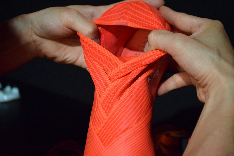 新素材を用いた商品開発は、新しい織り構造のアッパーデザインとなりました。商品の色や形も非常にユニークですが、この新構造により、履き口の足入れの容易さがこれまでのレースレスデザインのスパイクにはないものとなっています。