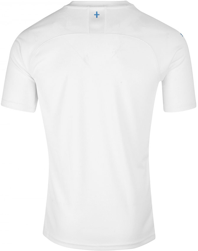 背面はストライプが入らない、かなりシンプルなスタイル。首元にはホームタウンであるマルセイユ市の旗・紋章と同じ“ブルーの十字”をプリントする。