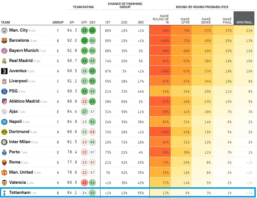 これはグループステージ第3節終了時の確率。スパーズはインテル、バルセロナに敗れ、PSVには引き分けて、1分2敗という最悪の滑り出しだった。