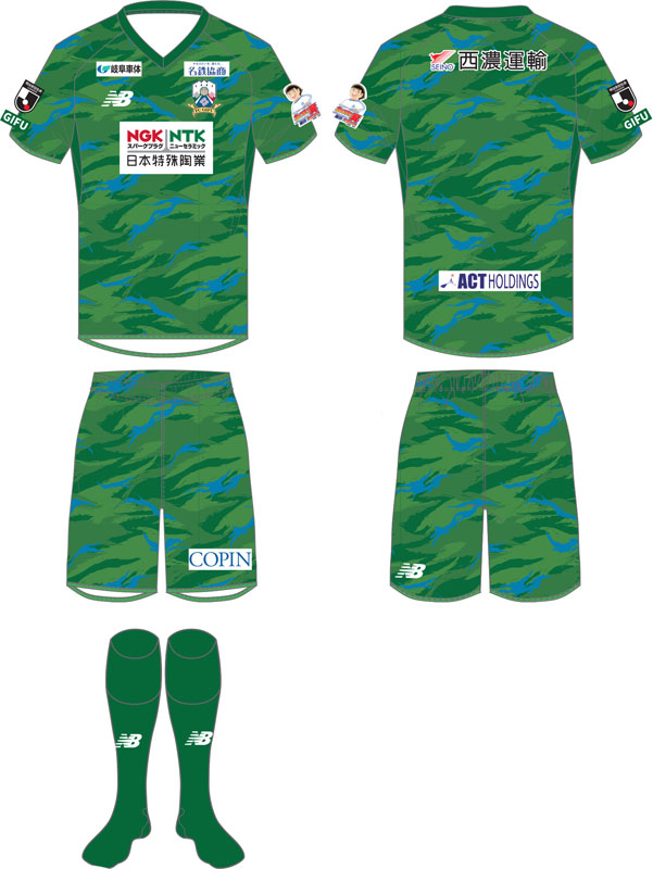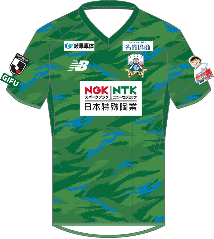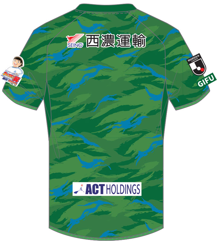 今年の夏季限定ユニフォームの色は、フィールドプレーヤー用はグリーン。カモフラージュ柄をベースに、涼しげなブルーをアクセントカラーにデザインした。「力強い山々」と「清らかな川の流れ」をイメージし、岐阜の夏らしさが盛り込まれている。