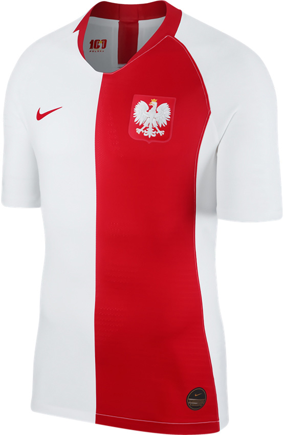記念すべき100周年ユニフォームはホワイト/レッドのバイカラー(ツートン)を採用。どちらの色も代表チームのキットカラーだが、今回はシンプルにポーランド国旗をデザインし、100年の歴史を表現。