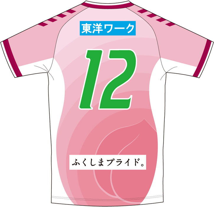 背番号は葉の色でもある緑を配する。その下には、福島県で生まれ、つくられるものの誇りを表現した「ふくしまプライド。」のロゴマークを掲出。