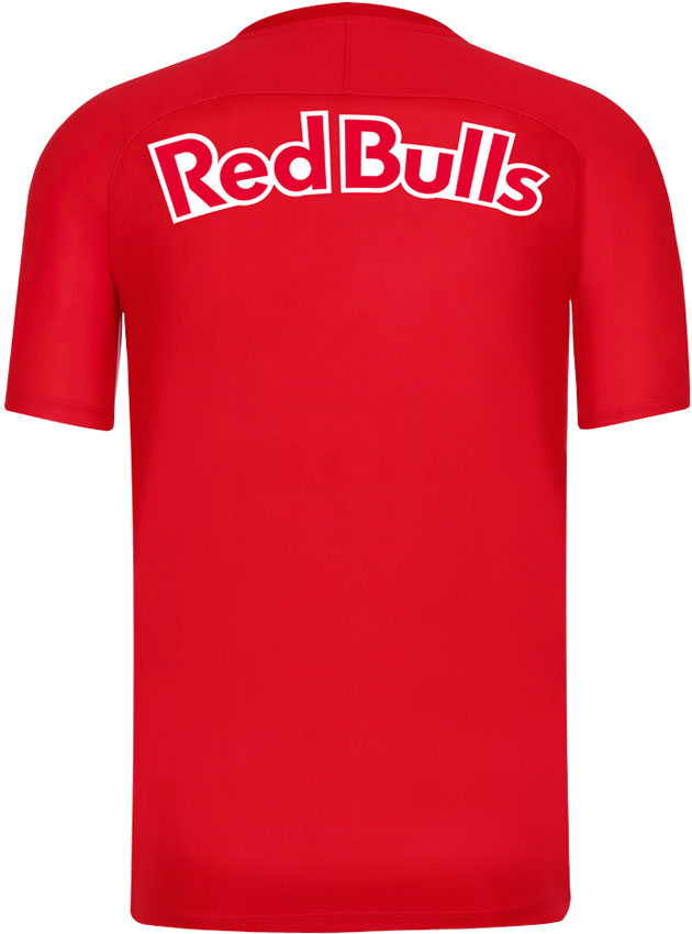 背面にストライプ柄は無く、シンプルにレッド一色に。背中にはアーチ型で「Red Bulls」をプリントする。