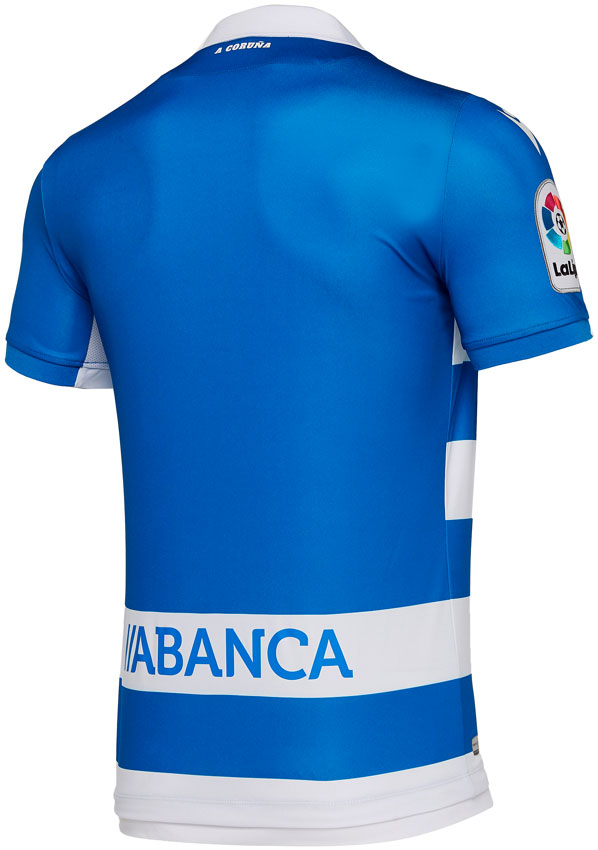 背面の首元にはホームタウン名“A Coruña(ア・コルーニャ)”をレタリング。ストライプは腰部分で止めて残りはブルー一色に。胸スポンサーは「Estrella Galicia(ガリシアのビールブランド)」、腰部分は「ABANCA(ガリシア州の銀行)」で継続する。